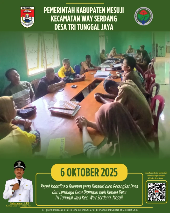 DESA TRI TUNGGAL JAYA - Pemerintah Desa Tri Tunggal Jaya bersama dengan seluruh lembaga desamengadakan Rapat Koordinasi Bulanan di bulan September 20225 yang dipimpin langsung oleh Kepala Desa. Rapat ini bertujuan untuk menyatukan visi dan misi dalam pelaksanaan program pembangunan desa serta menyikapi berbagai isu penting yang ada.